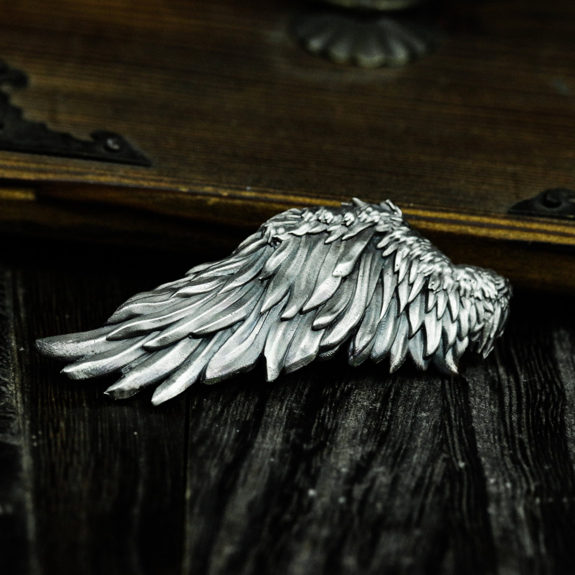 A single wing, beautifully layered with fine feather detailing, this pendant evokes grace, vulnerability, and the memory of flight. A symbolic piece representing protection, freedom lost, or rebirth after pain.