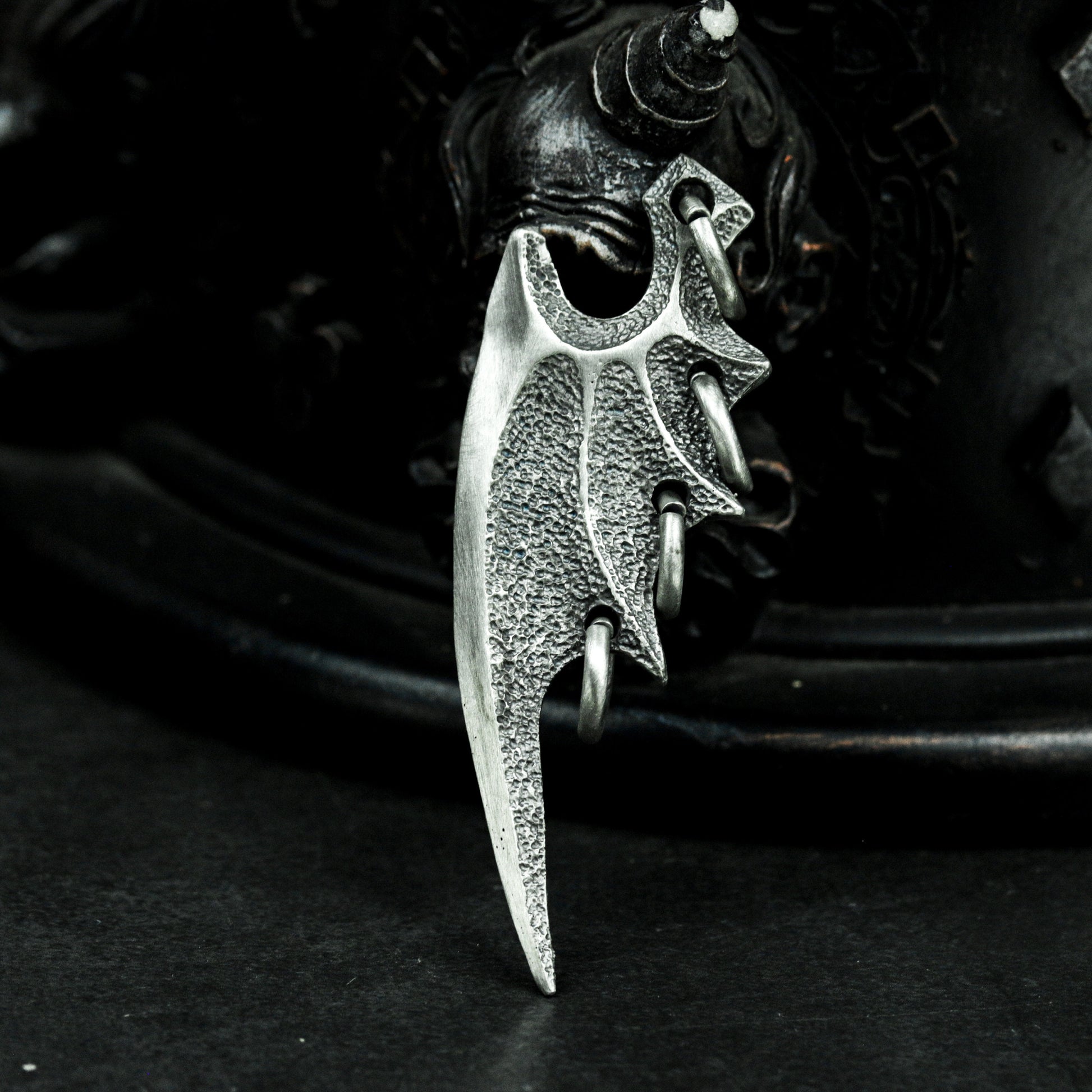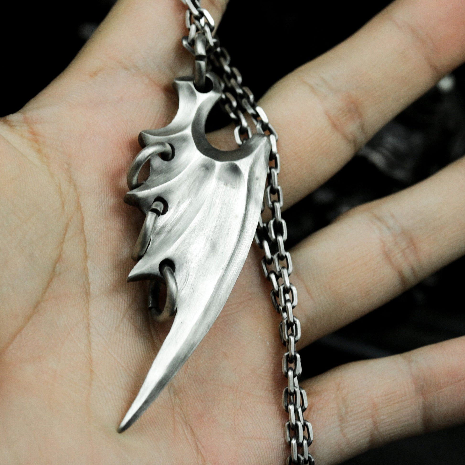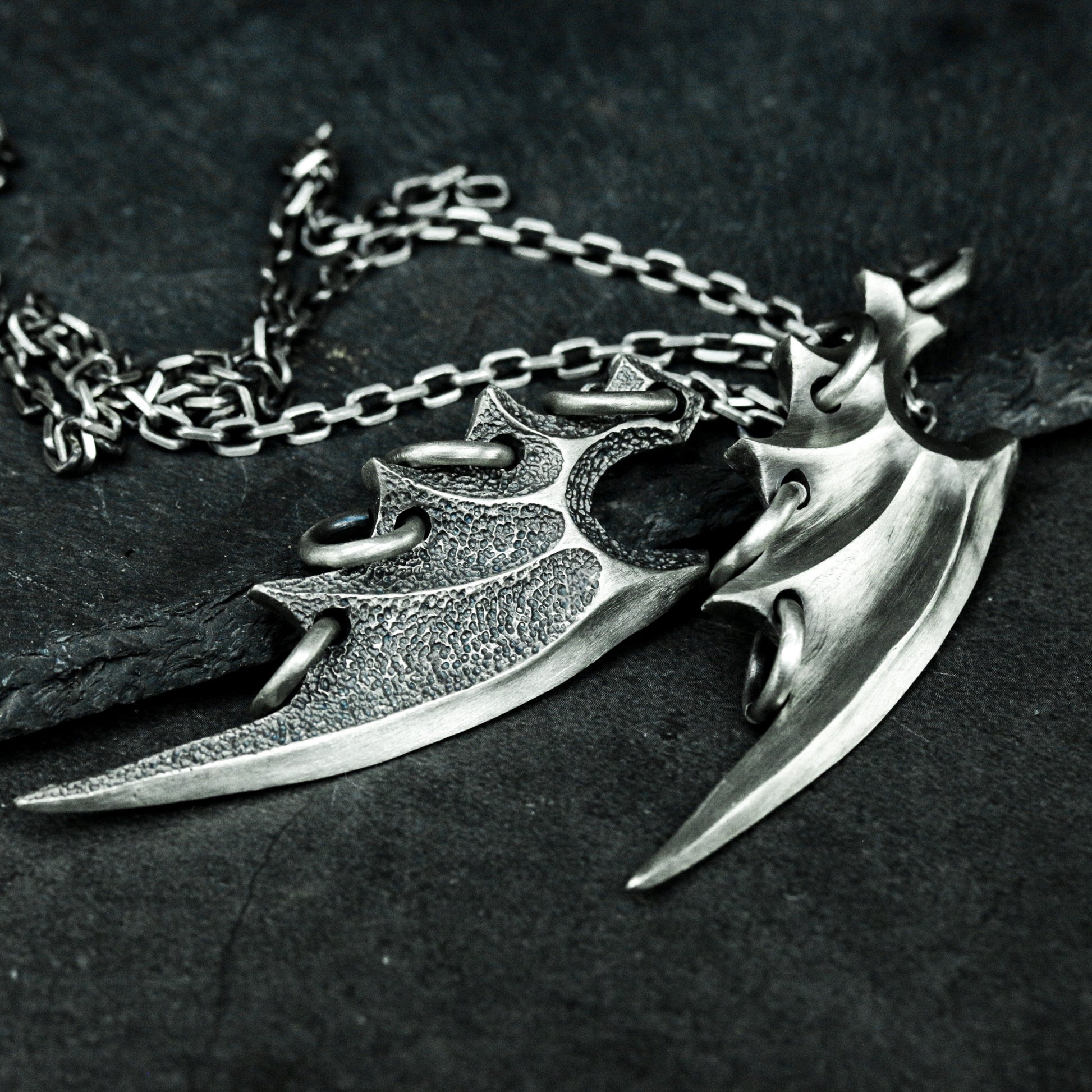 This pendant set features two unique bat wing designs¡ªone smooth and sleek, the other sharp and aggressive. Representing freedom through darkness, they evoke gothic mystery and the spirit of the night.