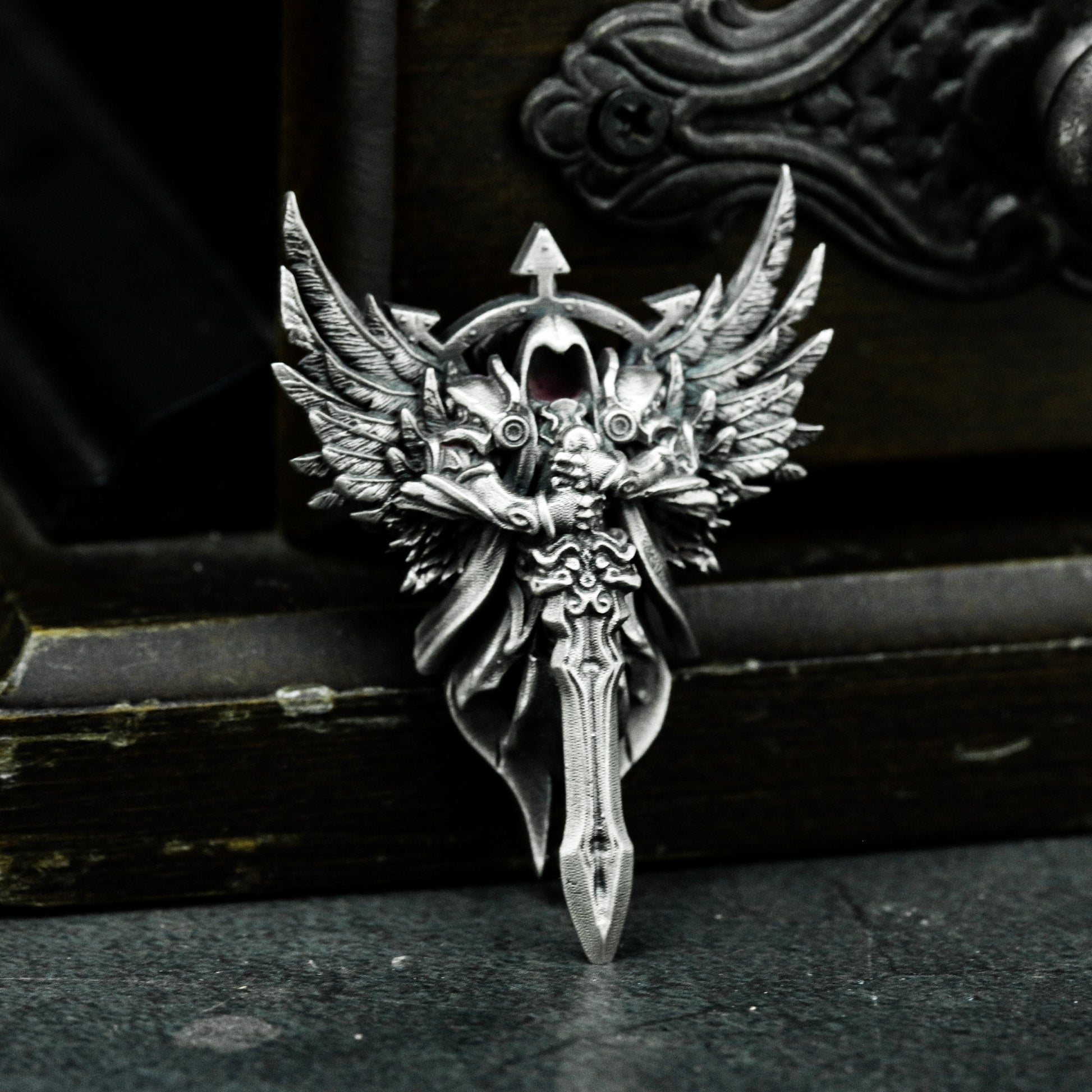 This pendant combines a crowned skull, outstretched wings, and a downward-pointing sword into one powerful gothic emblem. It represents ultimate rule over life and death¡ªwhere elegance meets brutality.
