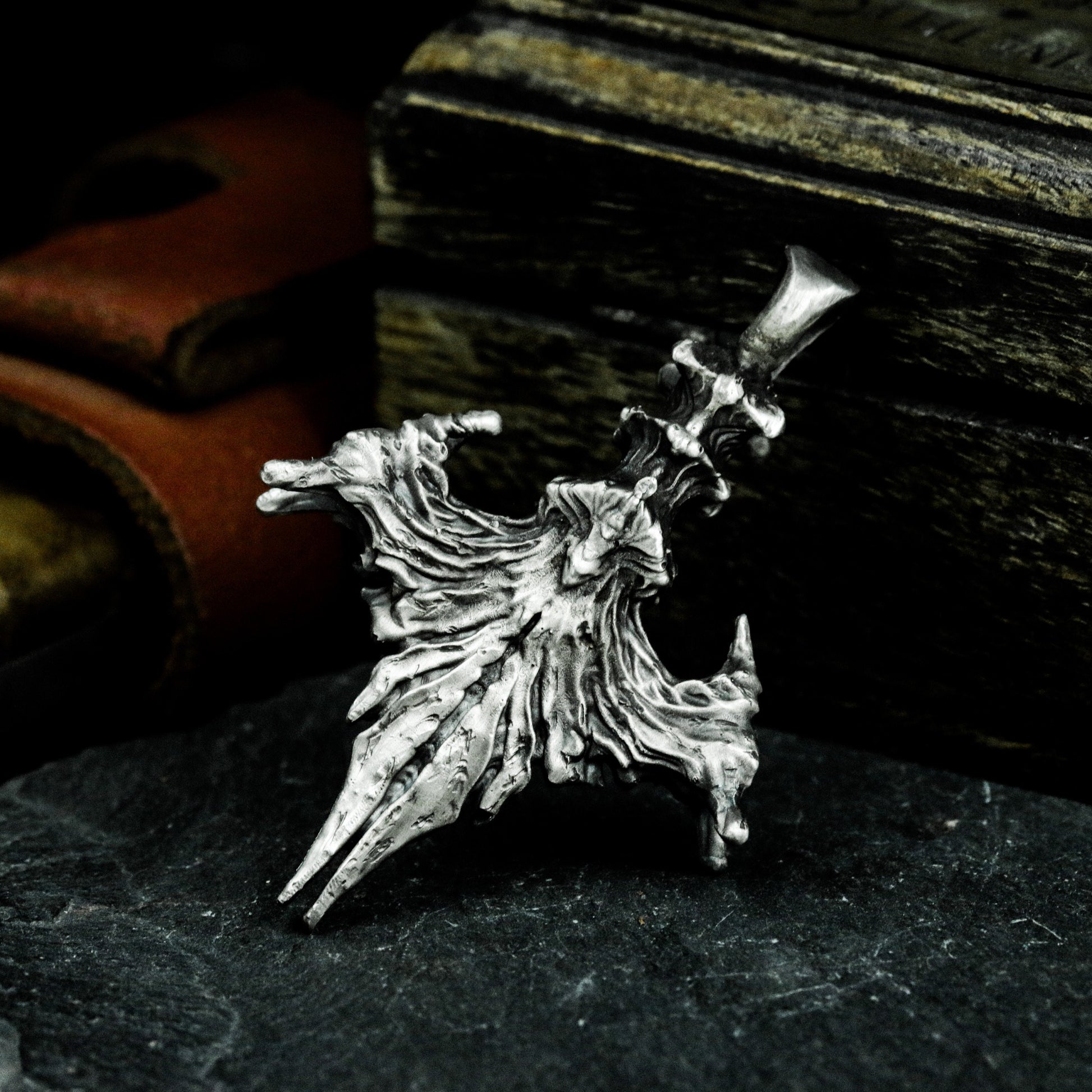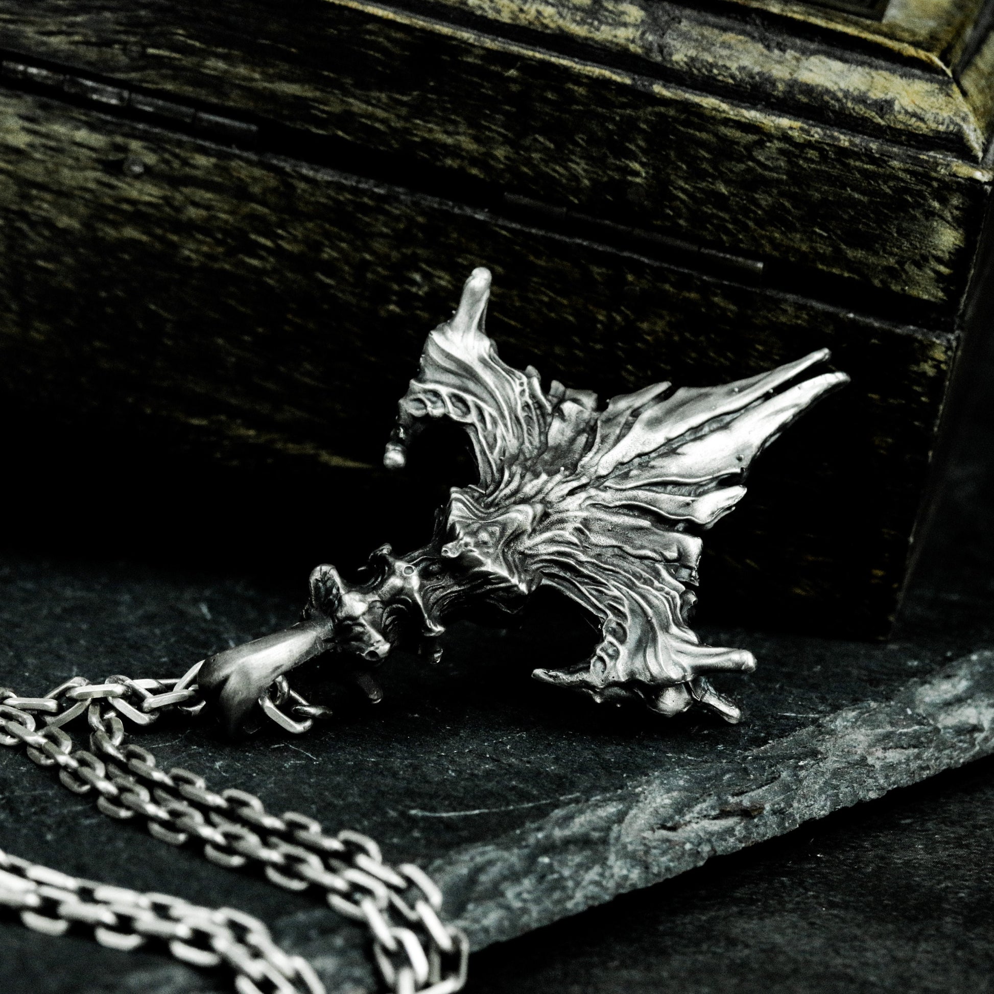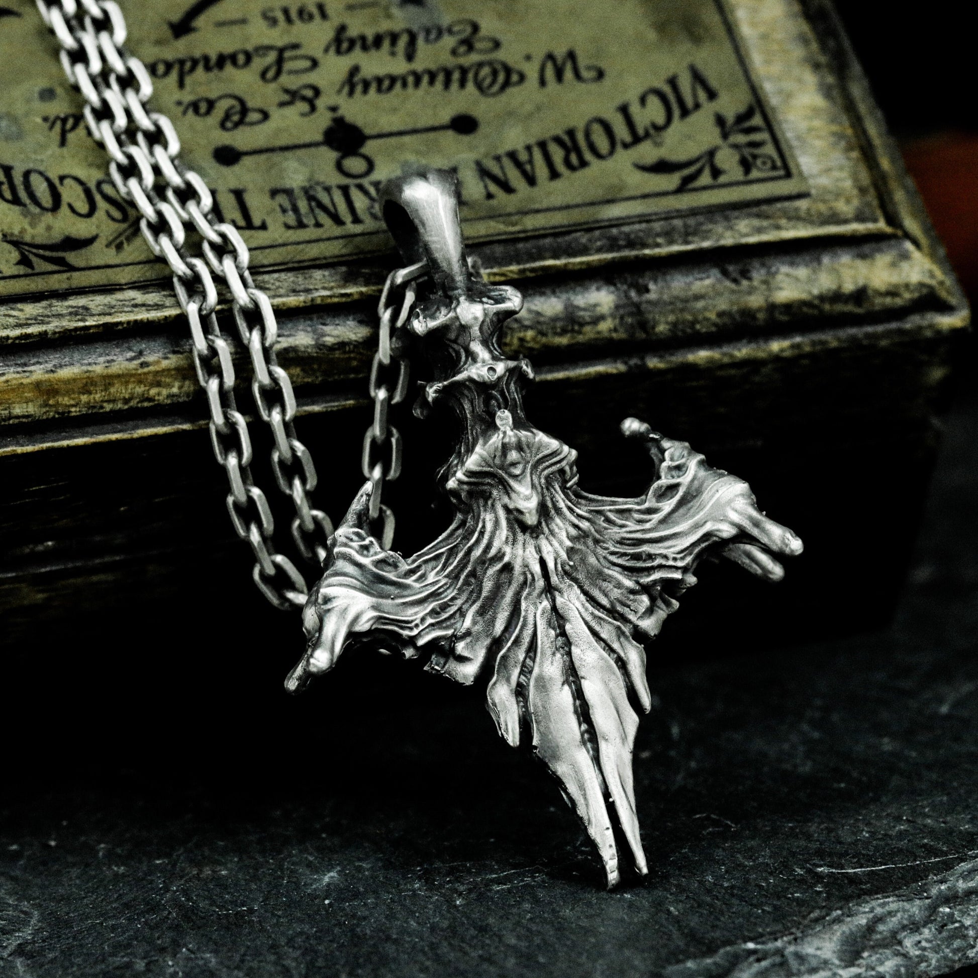 This pendant features a spread raven wing with subtle skull detail, symbolizing freedom, fate, and the mystery of death. A perfect talisman for gothic souls and seekers of symbolic power.