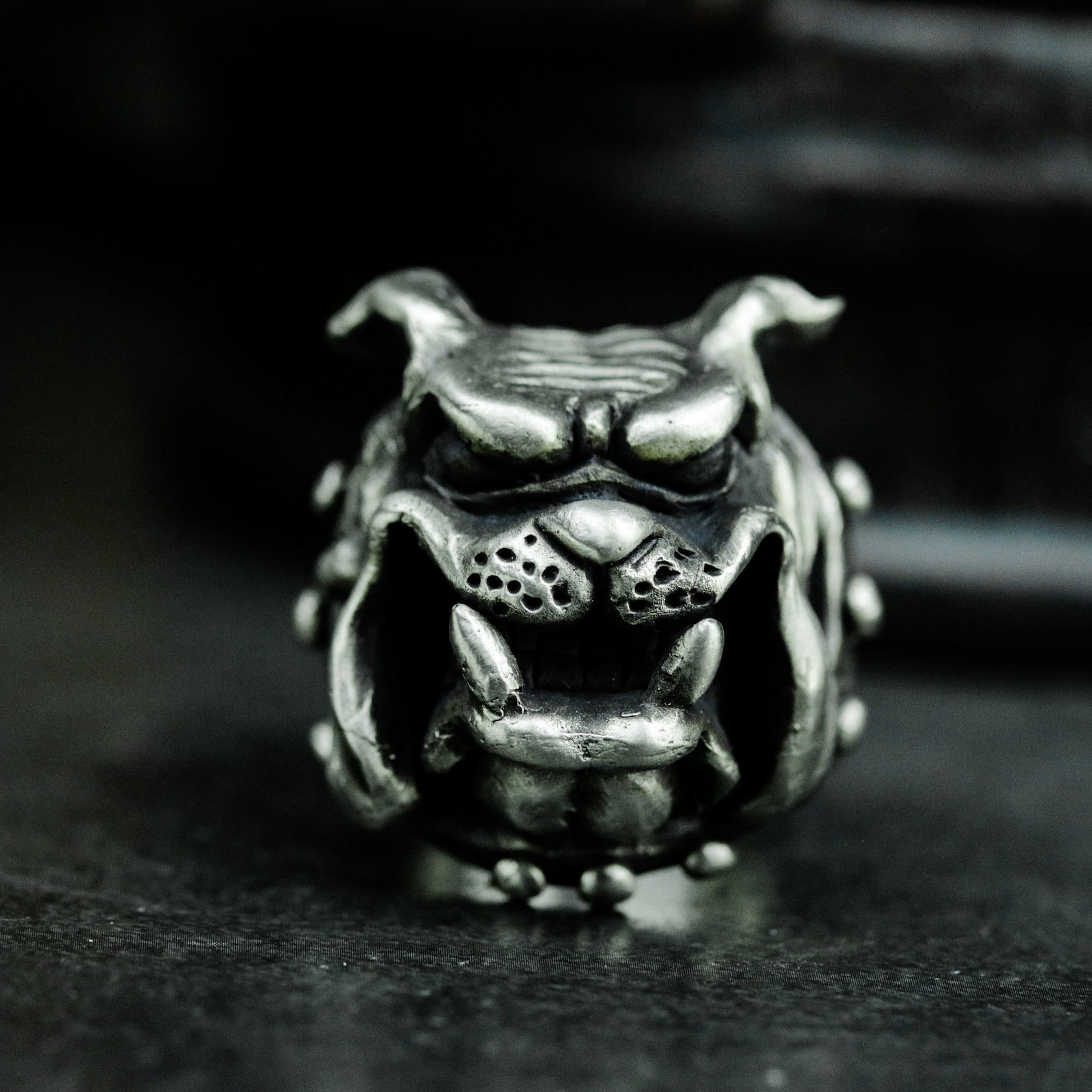 This aggressive bulldog ring features a snarling expression with bared teeth and muscular form, capturing loyalty, grit, and untamed strength. A fierce companion forged in silver.