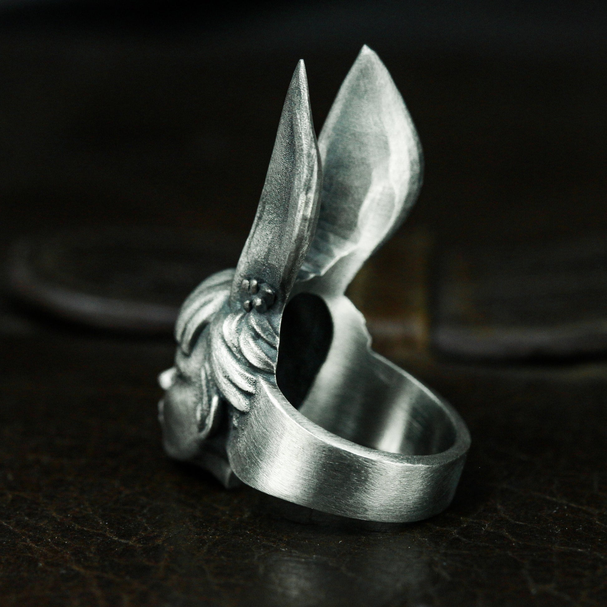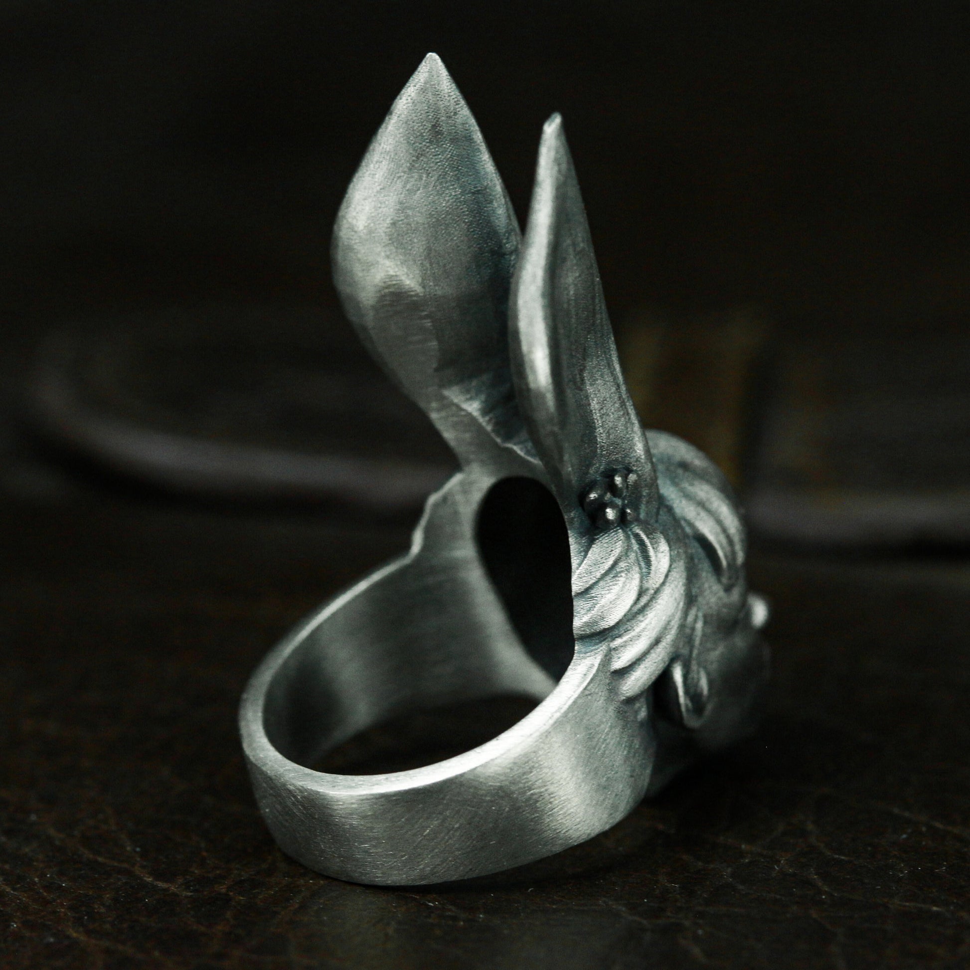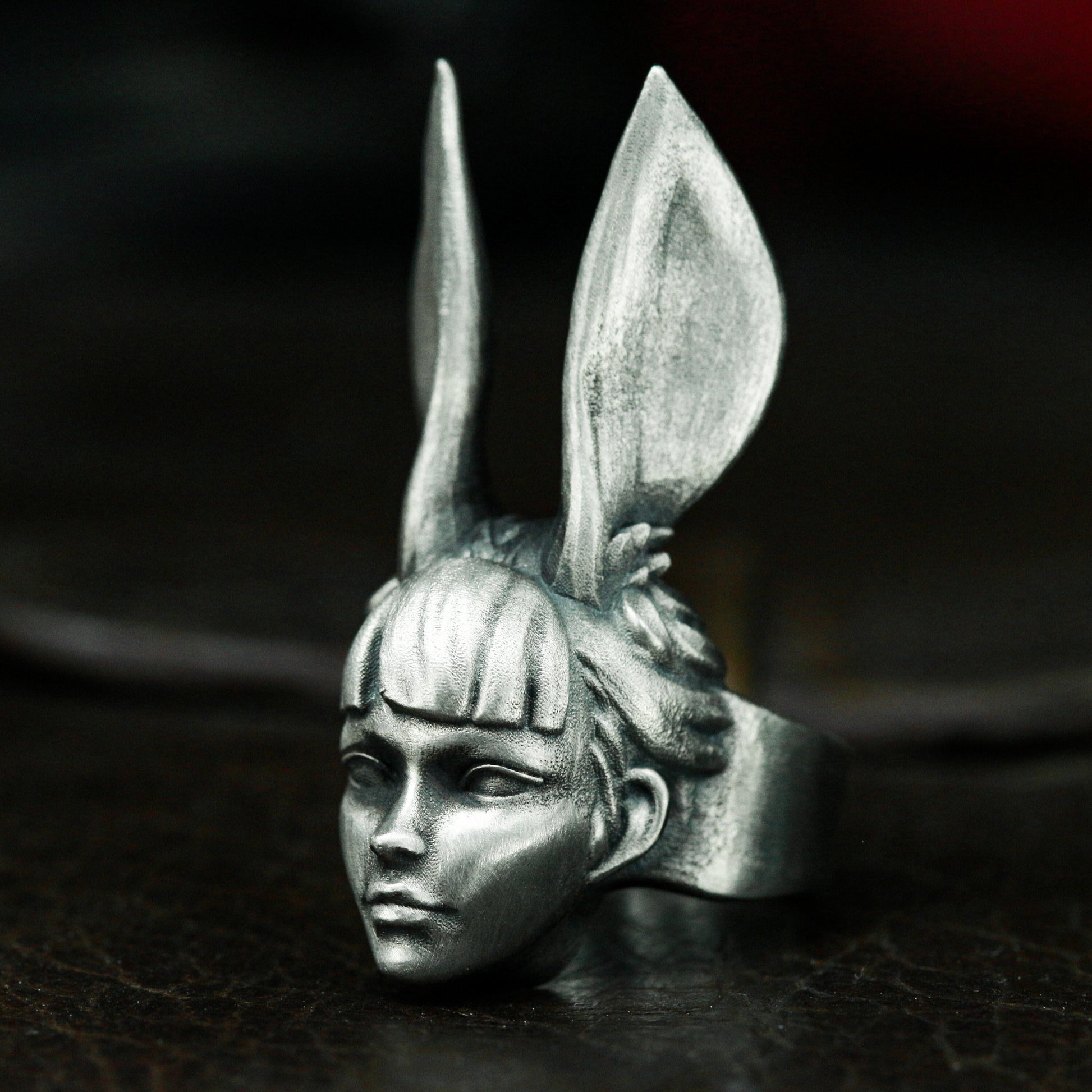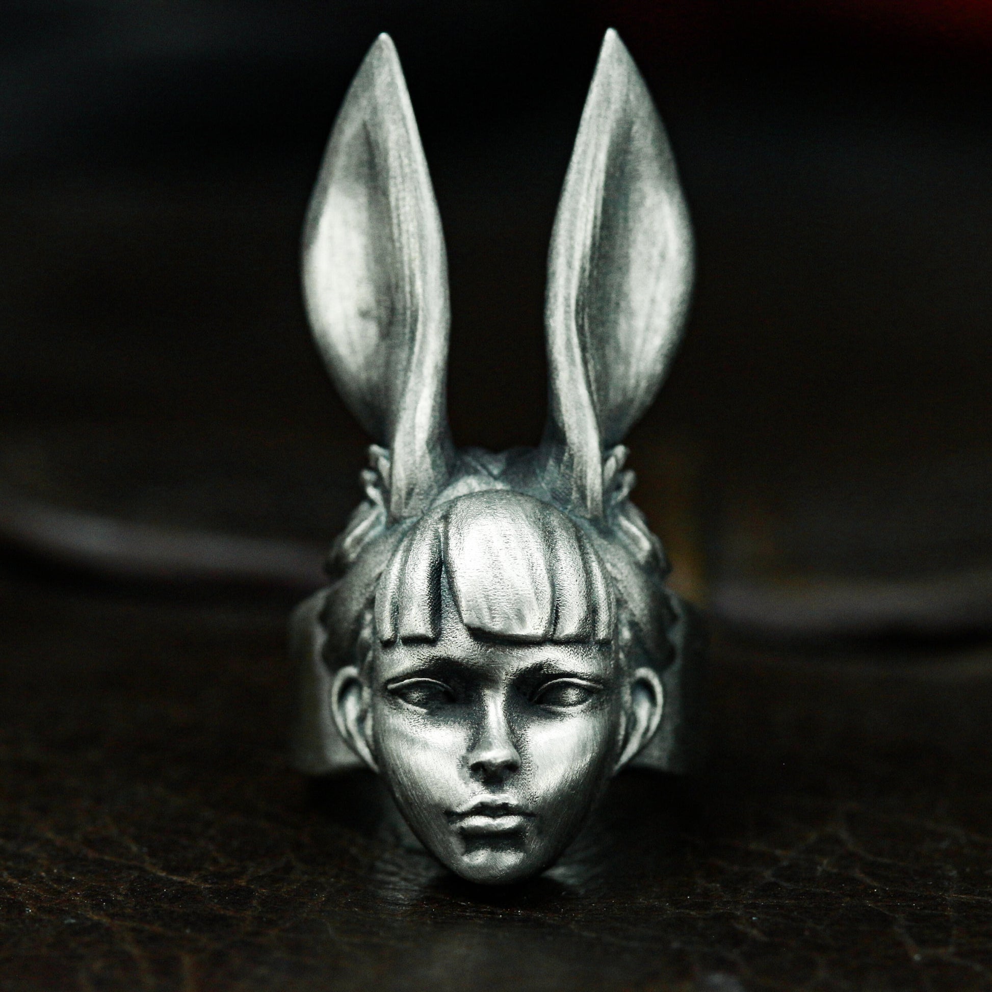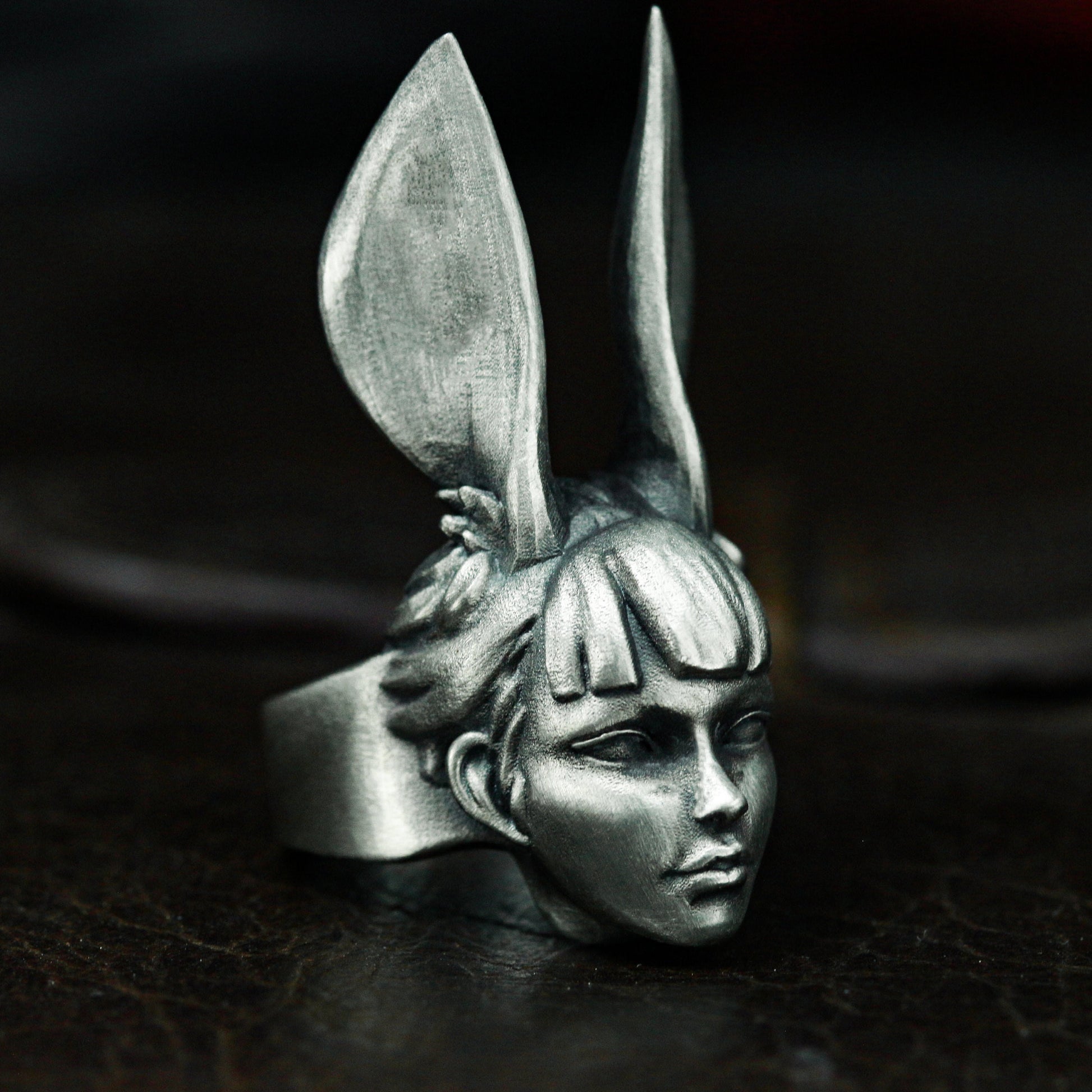This ring features a surreal female head with tall rabbit ears, blending fantasy and fashion in a haunting, dreamy expression. A conversation piece that plays with identity and illusion.