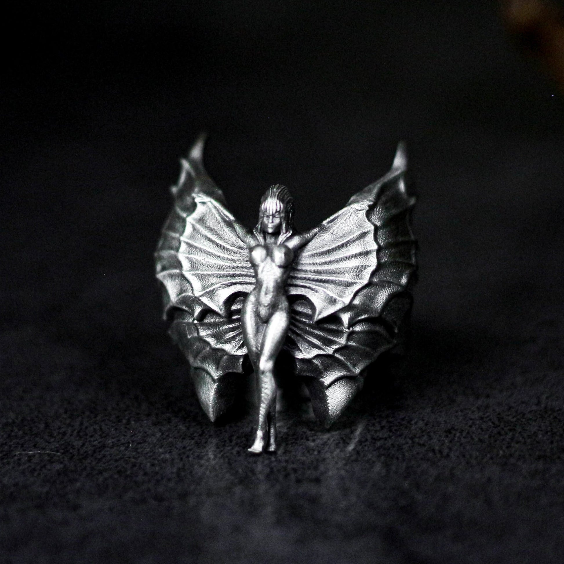 This detailed ring presents a winged fairy figure standing boldly between your fingers, representing ethereal power, transformation, and magical femininity.