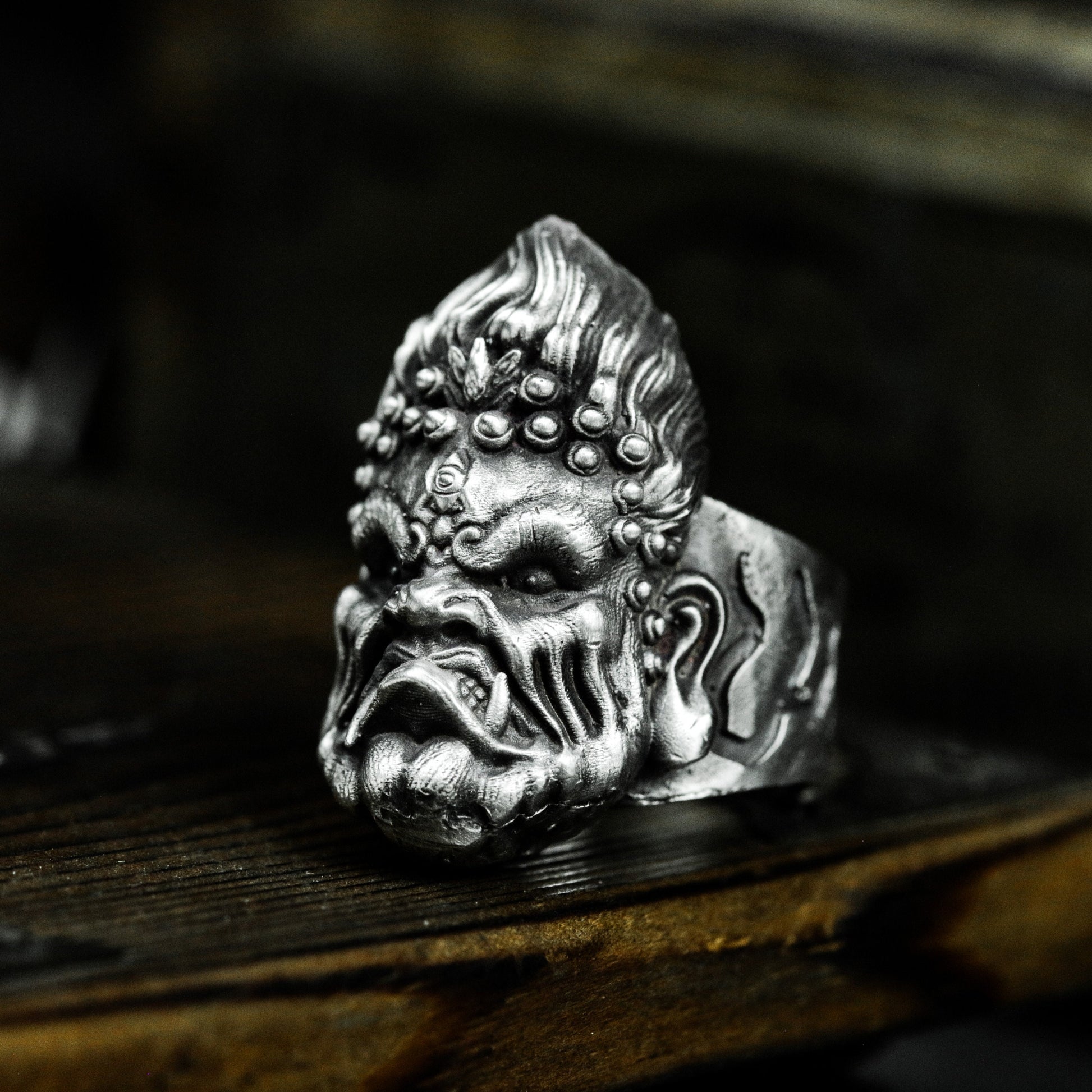 A bearded face twisted in fury, sculpted in bold relief. This ring resembles a wrathful deity, storm spirit, or mythic protector¡ªa force of nature turned to silver.