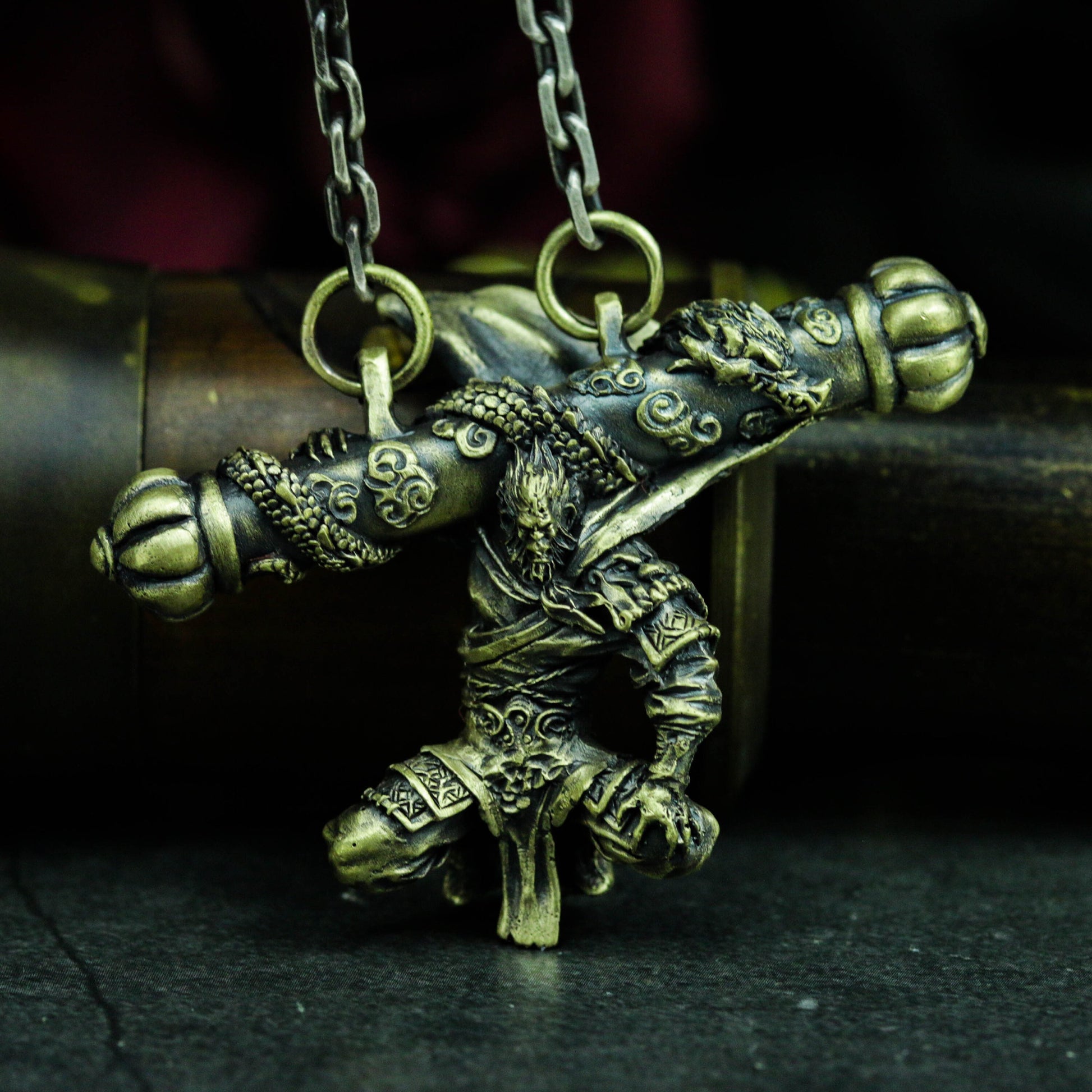 The Monkey King stands in a powerful battle pose, crossing his legendary weapons. This pendant is a tribute to his strength and defiance, capturing the essence of his heroic journey.