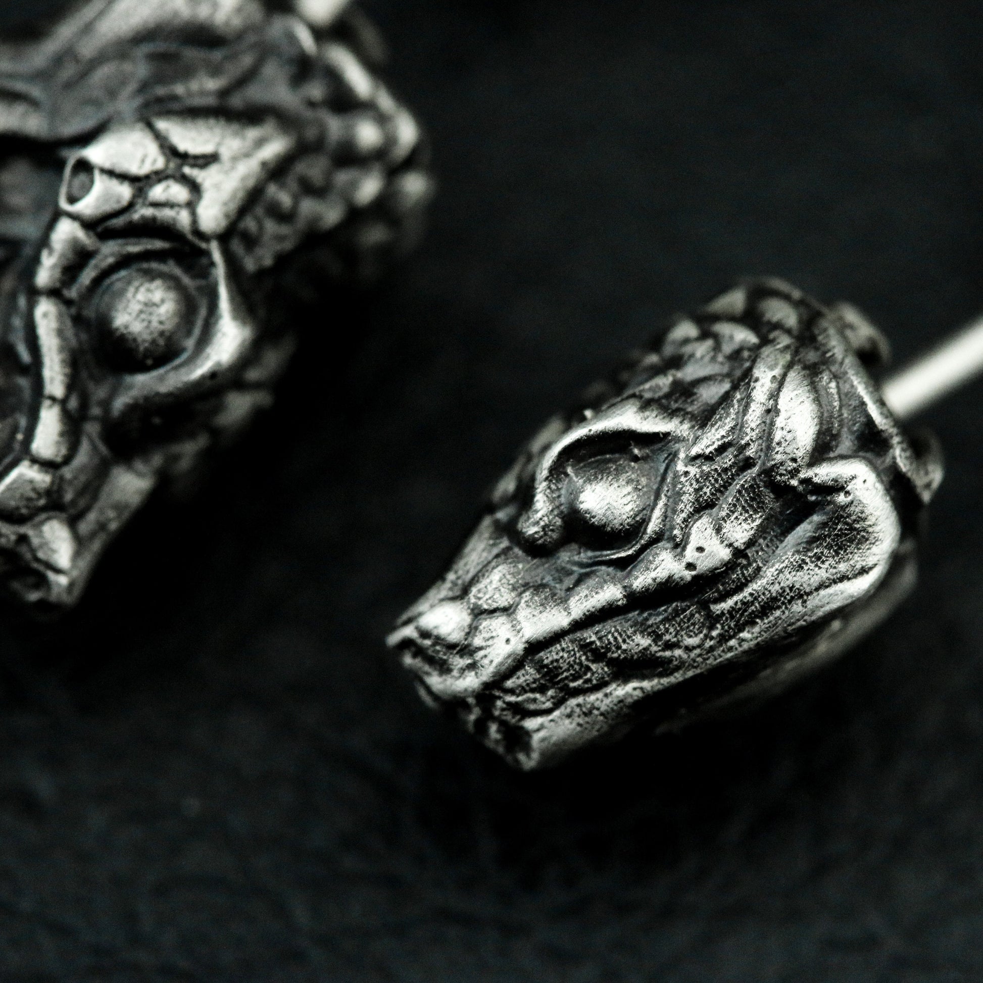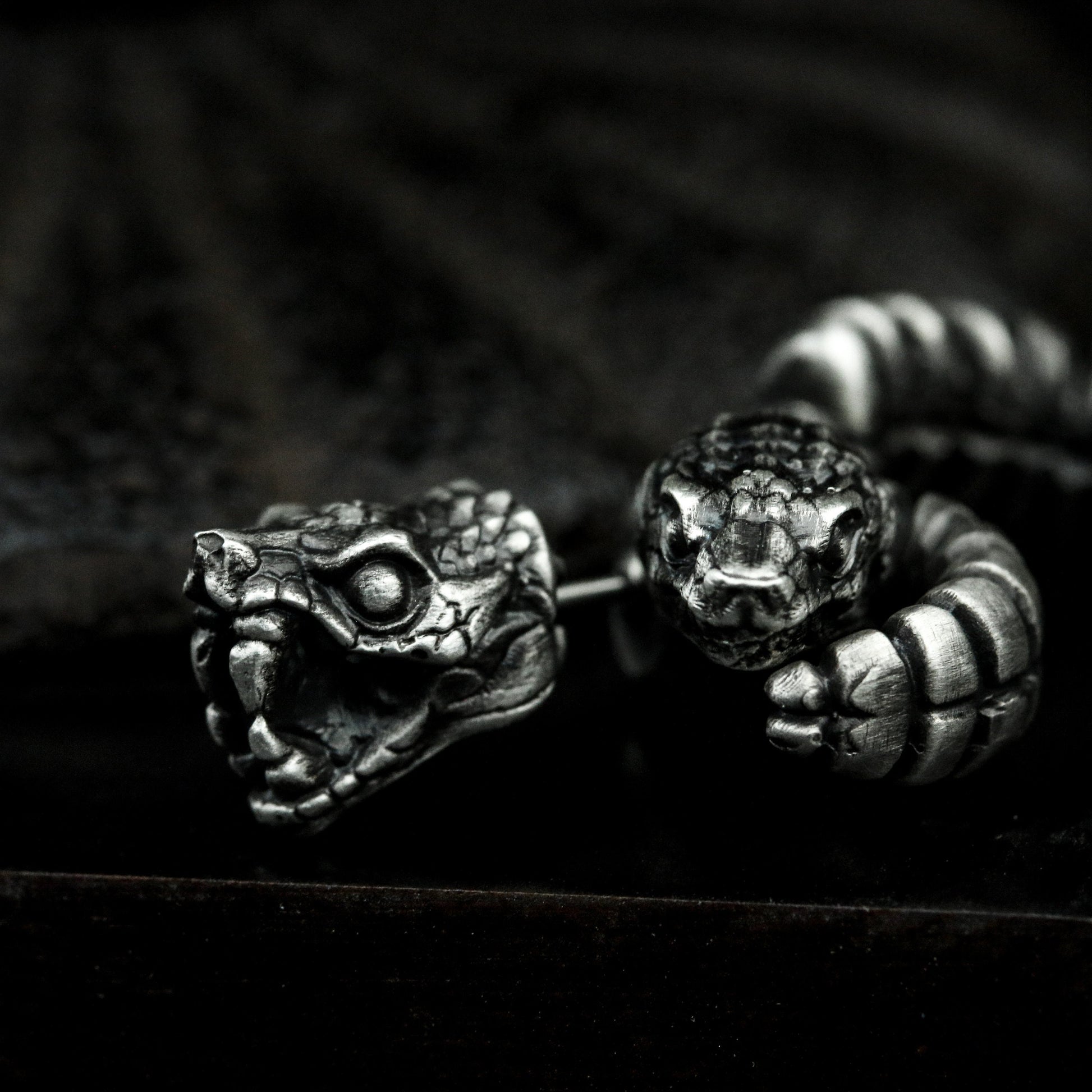 These silver bar studs with coiled rattlesnake detail strike with subtle danger. A refined touch of venom for gothic lovers of nature¡¯s edge.
