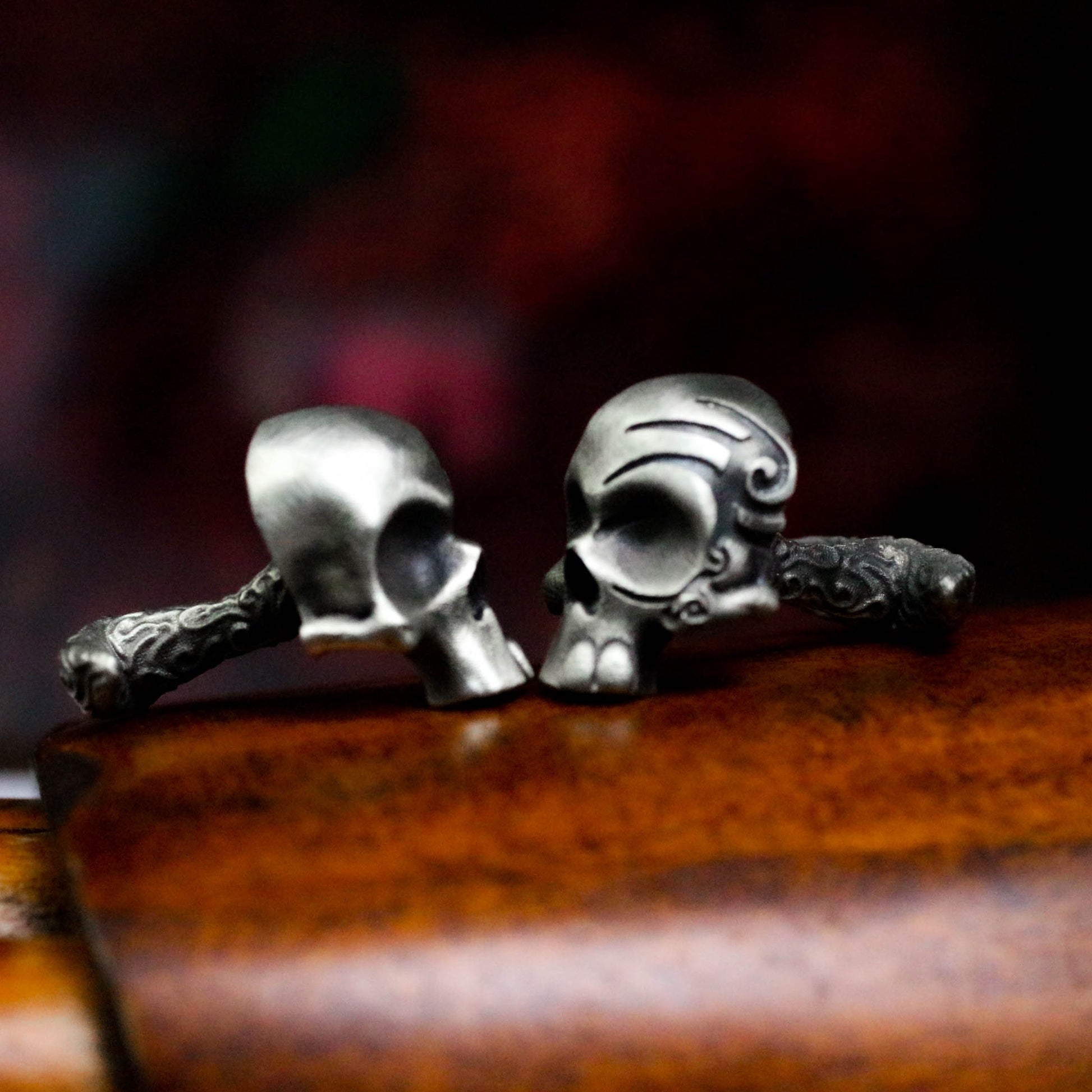 These cufflinks feature a baroque-inspired design, combining the mystery of runes and the sharpness of a skull. Drawing on Viking and Norse symbolism, they represent power and protection. Ideal for anyone who loves dark elegance and unique accessories, these cufflinks are perfect for weddings, gifts, or gothic style aficionados.